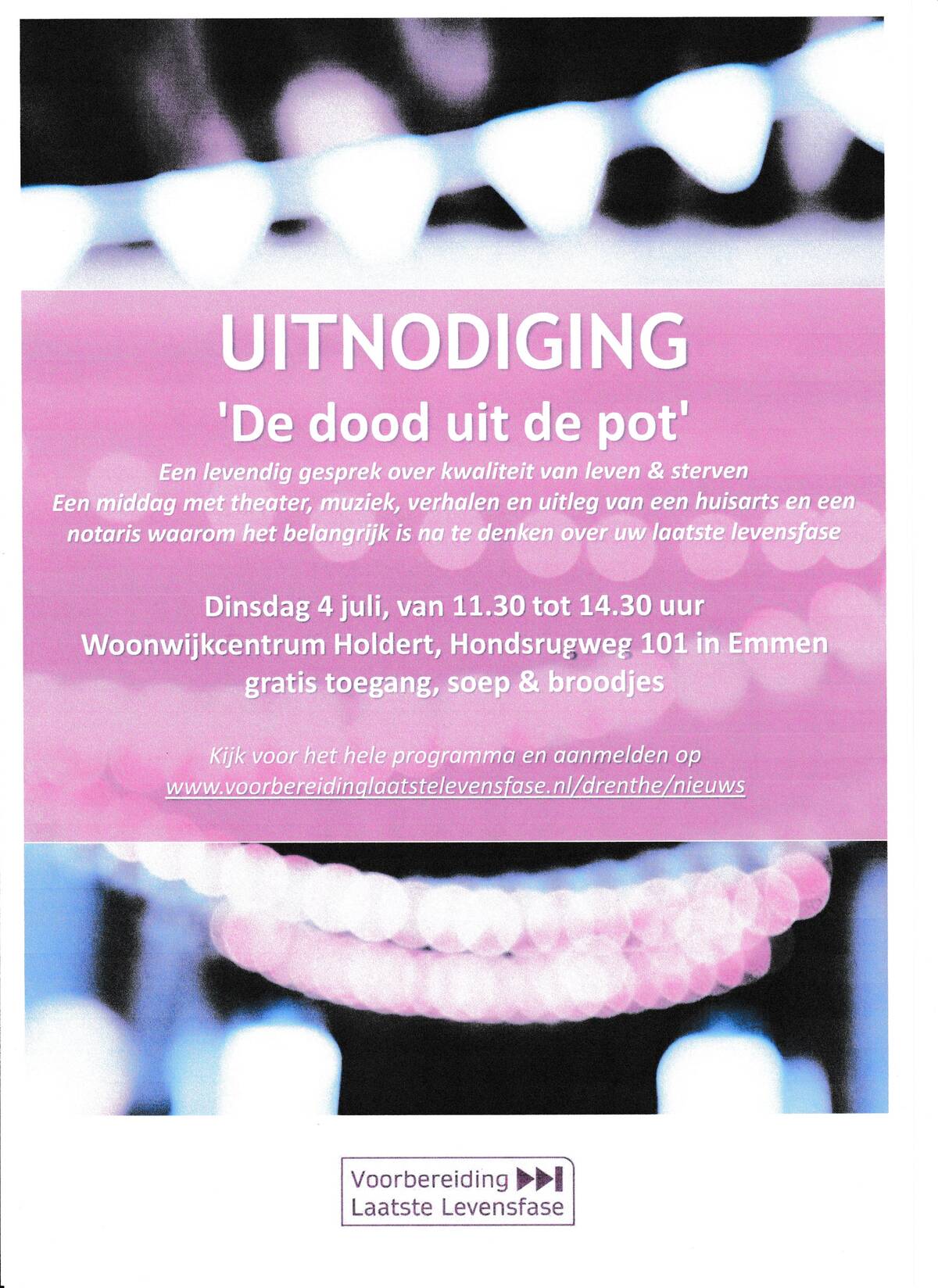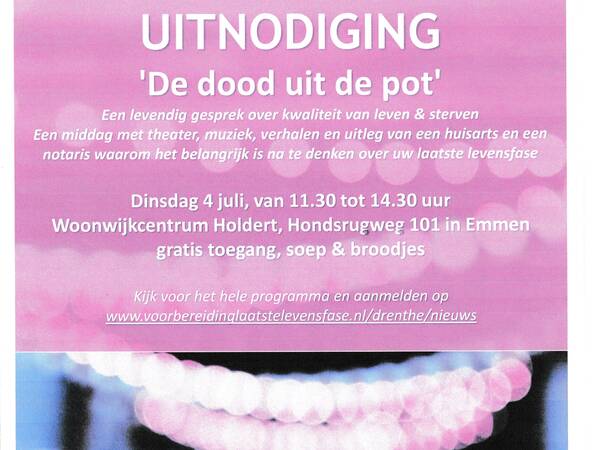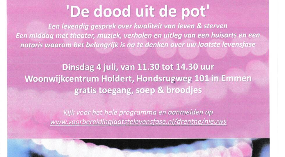 14 juni 2023"De dood uit de pot" Een levendig gesprek over kwaliteit van leven & sterven. Een middag met theater, muziek, verhalen en uitleg van een huisarts en een notaris waarom het belangrijk is na te denken over uw laatste levensfase